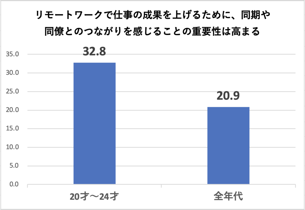 20代前半は他の年代よりも、仕事の成果を高めるため【同期や同僚とのつながりを感じること】が必要と考えている