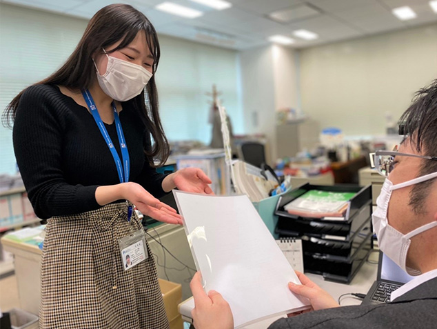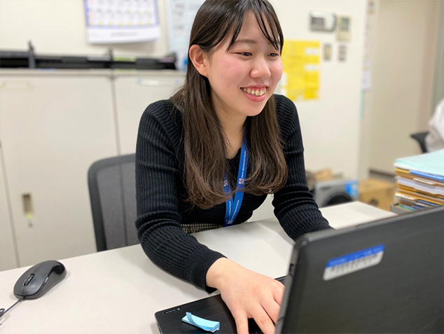現在は、管理部の人事総務課で、名刺や文具、備品などの発注や、本社・支社間の郵便物の取りまとめ、レンタカーの使用申請、そして契約書の管理を担当しています。また、新卒採用にもサブとして関わっています。
