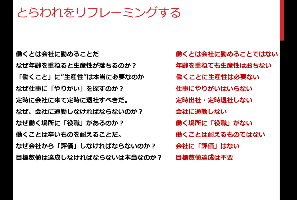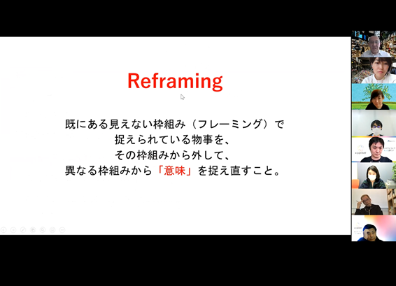 ここからは、「Reframing(リフレーミング 自分の枠組みを外す)」というアプローチを使って思考実験に入っていきます。