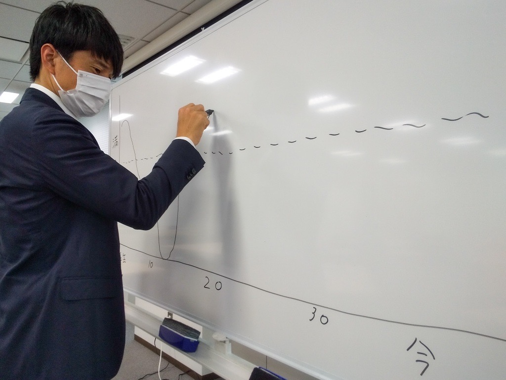 ホワイトボードに自らのライフラインを書き始める小林さん。じっくり考えながら描き進めていきます。