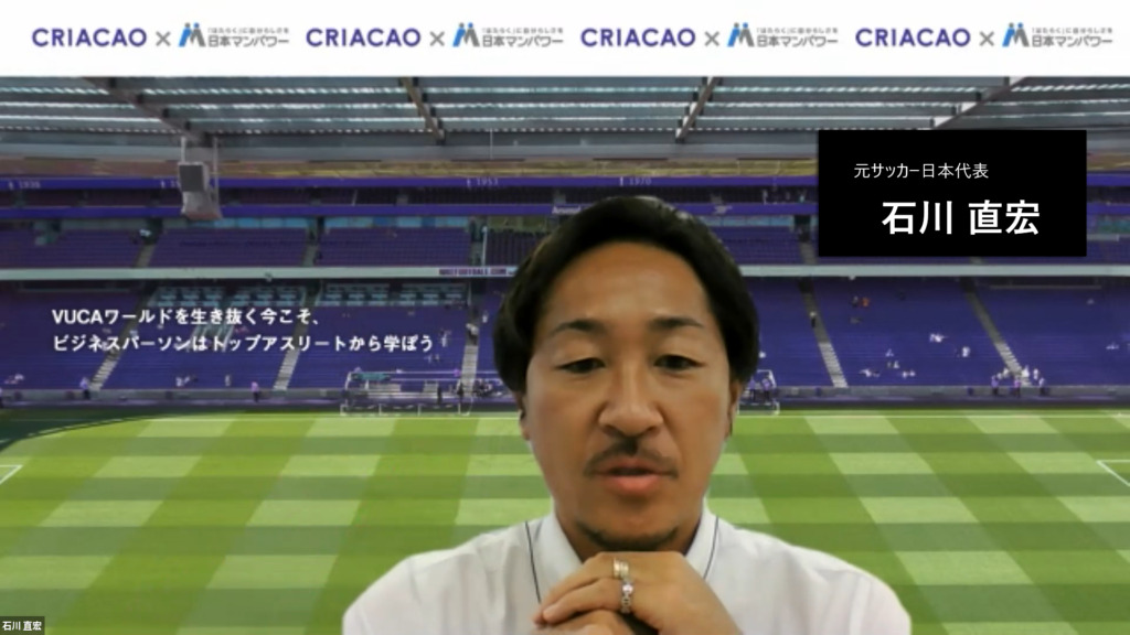 2021年7月16日のトップアスリート研修体験会は「元サッカー日本代表から学ぶ『逆境』を乗り越えるマインドとは」というテーマで、元サッカー日本代表の石川直宏さん(FC東京クラブコミュニケーター)をお招きし、オンライン開催しました。ファシリテーターは株式会社クリアソン竹田さんでした。