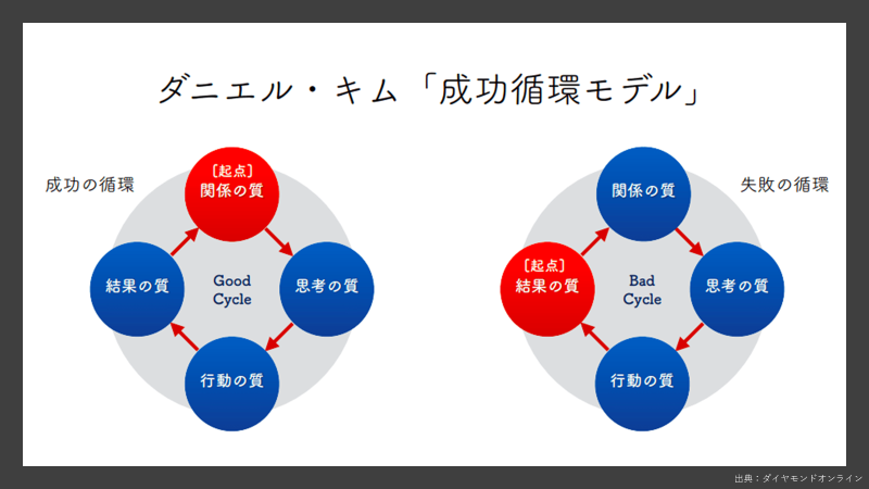 成功循環モデル(下図参照)にもあるように、いい影響を自分が与えれば、いい影響が返ってくるけど、自分に矢印が向いてないと良くないサイクルに陥ってしまう。関係の質を高める意味でも、自分の状況を知りながら、周りにどのような影響を与えられるかを考える。そうすると言葉の掛け方も、行動も変わってくる。結果的に、自分の居心地も良くなります。」