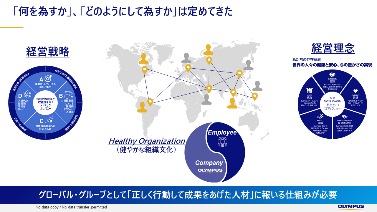 当社は日本で100年以上前に生まれ、歴史的に世界の各リージョン、各法人の自治を大事にする経営スタイルで成長してきました。つまり、日本は日本、という考え方です。しかし、上記の背景から、もはや日本人だけで日本のことだけを考えていればいいという状況ではなくなってきたことをご理解いただけると思います。こうした状況から、当社は「Transform Olympus」という企業変革プランを2019年にスタートさせました。その大きな柱の一つが「グローバル一体経営」です。その取組みの一つとして、経営トップ層の体制をグローバルを見渡して最適化できるメンバー構成にしてきました。