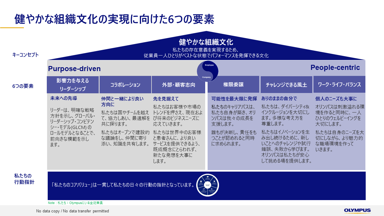 健康でベストな状態を保った上でお客様のために価値をしっかり提供する、という会社がめざす方向と1人ひとりが目指す方向が一致する状態を作ることが必要という考えのもと、会社のPurpose-driven、従業員のPeople-centricを両輪として、6つの要素を策定しました。そこには、会社が一方的に押し付けない、従業員のひとりよがりにならないことが大事だという問題意識があります。