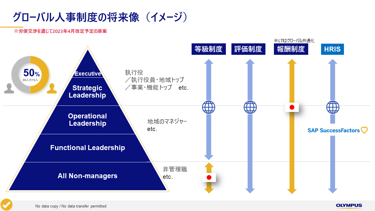 当社全体の階層を大きく括ると、このピラミッドのようなイメージとなります。(図)。ノンマネージャー層、一般課長層を含めて各機能を束ねるリーダー層、事業などの機能のトップ層、そして役員層です。このときに「キャリアは上がる一方ではない」ということをきちんと理解浸透させていきたい、と思っています。例えばノンマネージャーとしての仕事をやり続ける選択肢もあります。その一方、年齢に関係なく、その役割に適任と判断した時点で早く上がるチャンスはありますと。但しその役割が難しければ、1回出直すのもありだよ、と。
