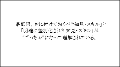 また、「何を学ぶか」という点で、ミニマムリクワイアメント(最低限習得すべき知識・スキル)として知っておくべき知見と「これで食っていける」という明確に差別化されたものとがごっちゃになっていると感じています。