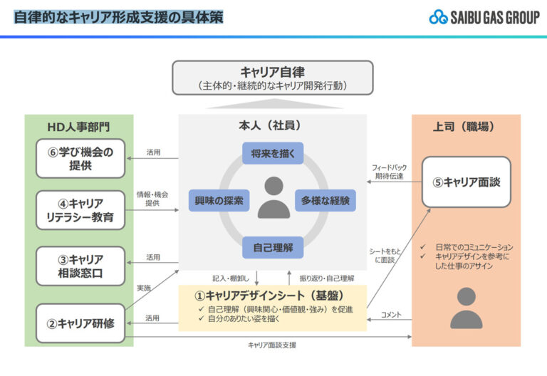 各施策を単発で行うのではなく、「キャリアデザインシート」が基盤になっていて、「キャリアデザインシート」に書いてある内容を基にキャリア研修を受講したり、様々な学びに取り組んだり、研修やキャリア面談で内省したことを「キャリアデザインシート」に反映したりする仕組みを整えたところです。