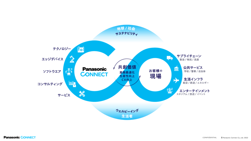 続いて、本年2022年に設立された新会社パナソニック コネクト株式会社人事部門の取組みを、同社CHROの新家さんからご紹介頂きました。同社は2022年4月、パナソニックグループの持株会社化によって設立された事業会社で 「現場から 社会を動かし 未来へつなぐ」というパーパスのもと、主にBtoB向けのソリューションを提供し、社会課題の解決にチャレンジしています。