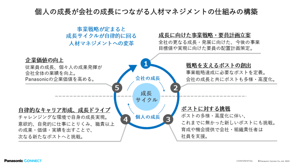 ビジネスの特徴としては、お客様の現場と、同社が提供するソリューションの共創を通じて、お客様とともに、よりよい社会、持続可能な未来を実現しようとする点です。人事部門においては「CONNECTer一人ひとりの成功と企業価値の持続的向上」を掲げ、2023年導入予定の「新人材マネジメント」と呼ぶジョブ型人事制度への切り替えに取り組んでいます。