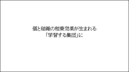 学習する個人であり学習する組織を、誰かに言われることなく、しかも画一的に勉強するのではなく、人によって異なる勉強をして、それが集まった時に足りないものを更に学んで補っていく「個と組織の相乗効果的な学習をする集団」にできればいいなと思っています。