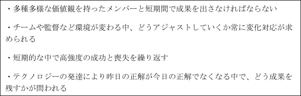 北原氏:アスリートが生きている環境には、上記のような特徴があります。ビジネスの世界も、アスリートの生きている環境同様、現在は非常に変化が激しく、予測不可能な状態になってきました。