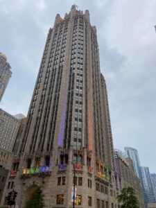 到着した当日、ダウンタウンを散策すると、ほとんどのビルがレインボーカラーに照明演出されていました。6月はシカゴのプライドマンスだったようです。LGBTQを誇りに思い、サポート・応援する気持ちを表す月間に町中で参画しているのが印象的でした。