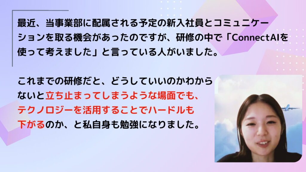 また、今年度の入社式にも参加しましたがConnectAIを活用したプログラム内容であり、新しい世代の方や世間の方々に当社の取り組みを知って頂く機会にもなったと思います。