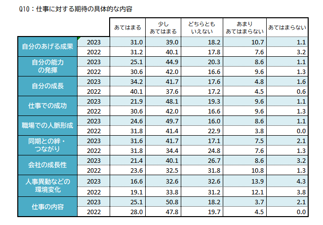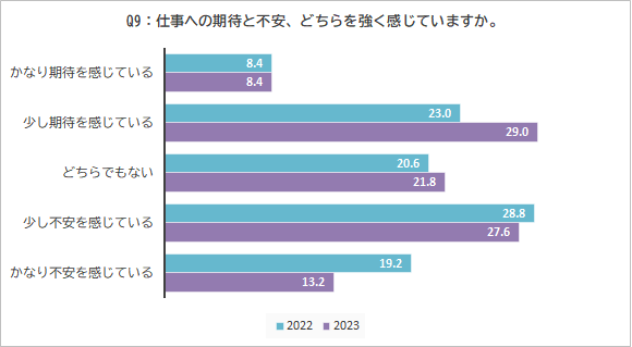 仕事に対する期待と不安に関する調査では、昨年と比較して期待を感じている回答が増え、一方で不安を感じている回答が減少しています。これにはコロナ禍が落ち着いてきた影響も大きいのかもしれません。「少し期待を感じている」は前年比6ポイント増加し、「かなり不安を感じている」は前年比6ポイント減少しました。