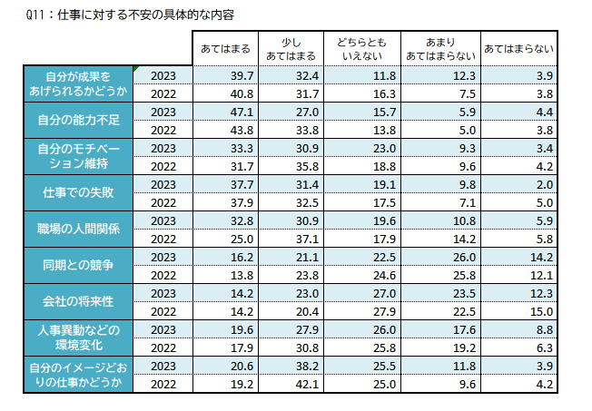 ⑧ 仕事の不安として「自分の能力不足」が昨年よりも増加傾向、職場の人間関係への不安も増加(Q11)