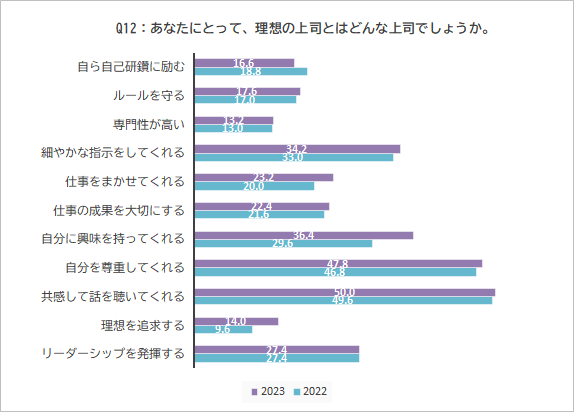理想の上司と、上司に求めるコミュニケーションについて尋ねた結果、理想の上司の要素として「自分に興味を持ってくれる」が昨年より6.8ポイント増加、「理想を追求する」は同4.4ポイント増加しています。