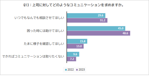 上司に求めるコミュニケーションでは「困った時には助けてほしい」が3.6ポイント増加し、逆に「たまに様子を確認してほしい」「できればコミュニケーションは取りたくない」の双方が2ポイント以上減少しています。昨年と比較すると、上司から自分に興味関心を寄せてもらうことへの期待が高まり、より細やかなコミュニケーションを求めている様子が伺えます。