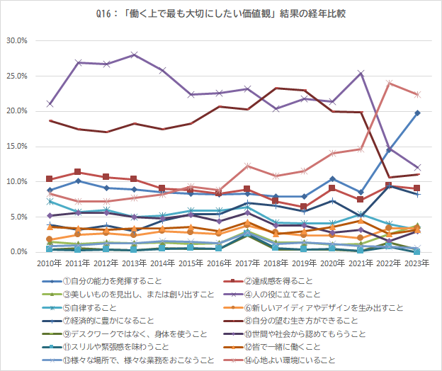2010年の調査開始以来、継続して尋ねている「働く上で最も大事にしたい価値観」では、今年も「心地よい環境にいること」が22.4%で第1位に選ばれました。