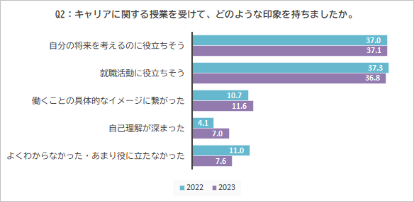 昨年と同様、回答者の6割以上が学生時代にキャリアに関する授業を受講しています(Q1)。この授業に対する印象を尋ねた結果、今年は「自己理解が深まった」との回答が2.9ポイント増加し、「よくわからなかった・あまり役に立たなかった」との回答は3.4ポイント減少。昨年よりも、キャリアの授業が自己理解に役立つと感じている傾向が強まっています。