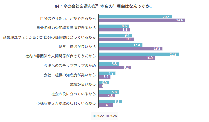 会社を選んだ本音の理由は、昨年2位だった「自分のやりたいことができるから」が前年から4ポイント増加し、最も多い回答となりました。