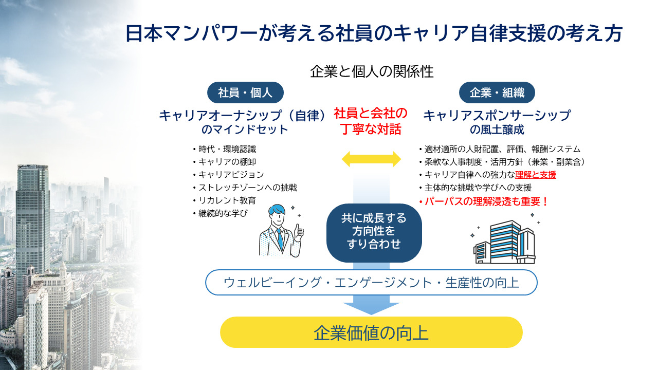 日本マンパワーはキャリアをずっとテーマに扱っている会社です。個人がキャリア自律をしてキャリアのオーナーシップを持とうといったことをやって来ましたが、最近は「キャリアのスポンサーシップ」という言い方で組織開発などに力を入れ始めています。というのも、スポンサー=会社や組織風土が変わらなくてはキャリア自律などできない、と考えるからです。そして、その際に大事なのは「対話」だと思います。