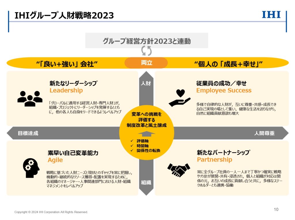 経営方針を実現するため、「IHIグループ経営方針2023」と連動する形で,「IHIグループ人財戦略2023」を掲げています。人財戦略では、事業変革と企業体質変革を実現するために“「良い+強い」会社”と“個人の「成長+幸せ」”を両立させることが重要だと考えています。つまり、新しいリーダーシップと素早い自己変革能力を併せ持ち目標達成にコミットするとともに,従業員の成功や幸せと新たなパートナーシップを通じて人間尊重を大切にすることです。これは人財施策のすべてに関わります。