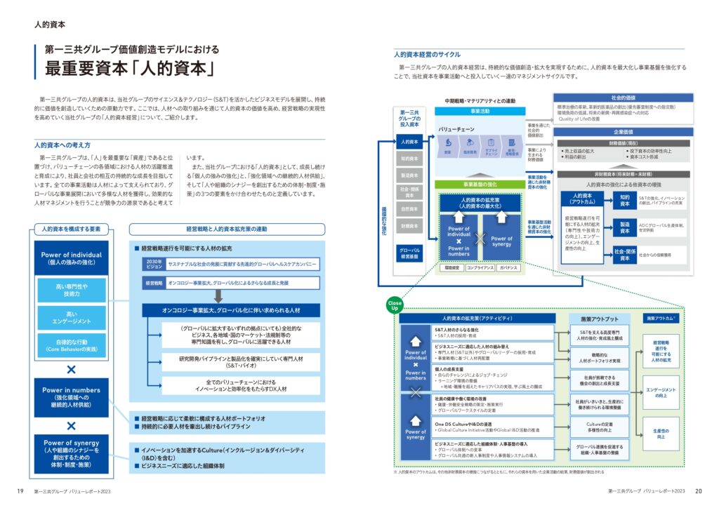 また、第一三共グループの人的資本経営の考え方でも、「人」を最重要な「資産」であると位置づけています。第一三共グループにおける「人的資本」の定義は、①「個人の強みの強化」、②「強化領域への継続的人材供給」、 ③「人や組織のシナジーを創出するための体制・制度・施策」の3つの要素をかけ合わせたものと定義しており、①はさらに、高い専門性、高いエンゲージメント、自律的な行動の要素から成り立っています。