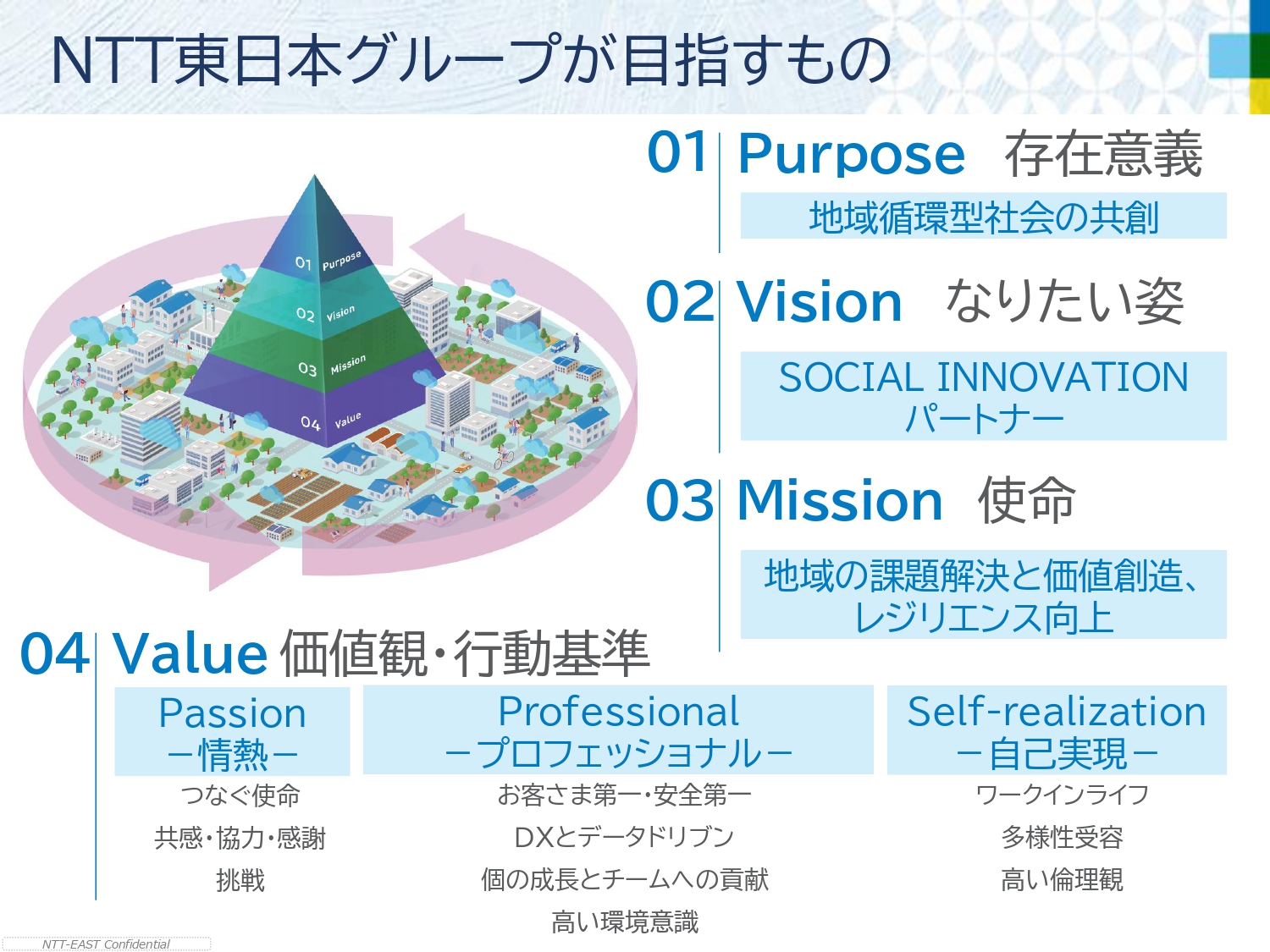 加藤:これまで光回線や電話サービス等の事業、地域の課題解決に向けた農業、芸術、eスポーツ等の新会社を立ち上げるなど、通信の強みを活用したソリューションの提供に力を入れてきました。今後は、課題解決にとどまらず、地域の価値創造、持続可能な仕組みを作るソーシャルイノベーション型の取り組みが求められており、ここにNTT東日本の役割があると考えております。