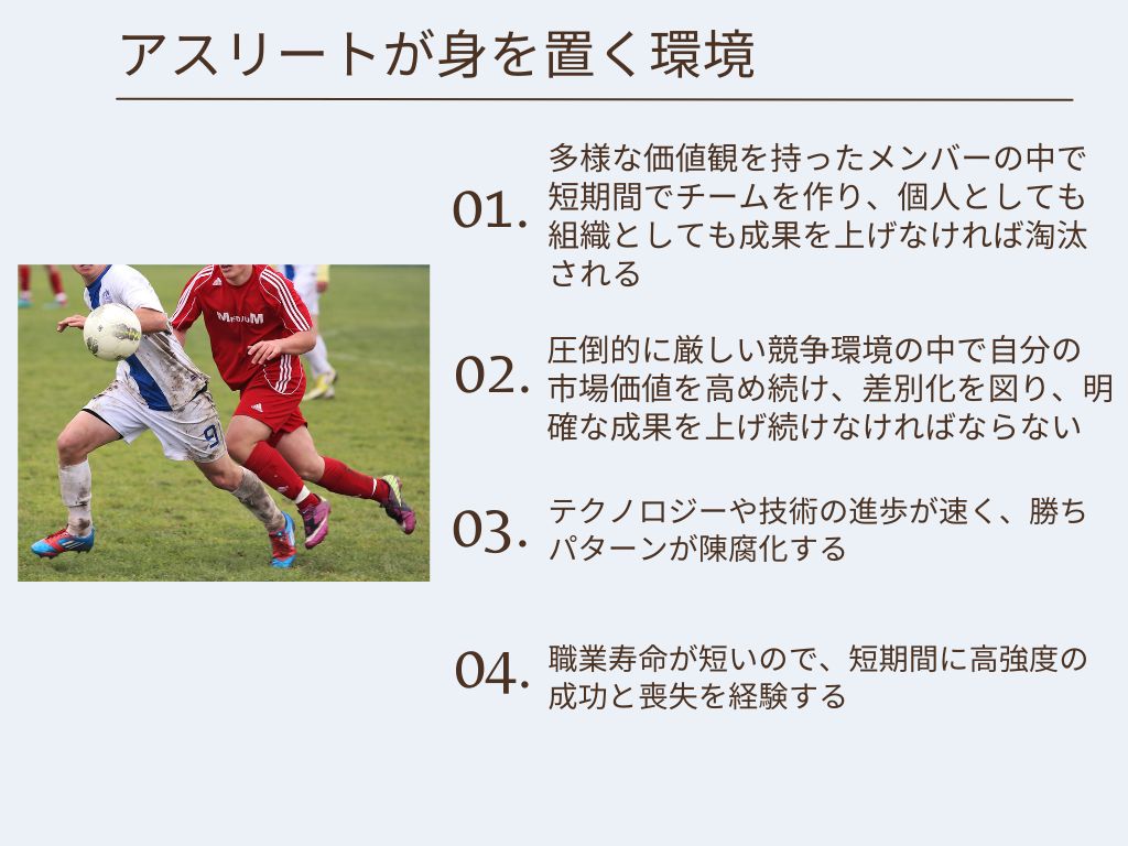 なぜかというと、アスリートが身を置く環境と、ビジネスの世界が似てきているからです。