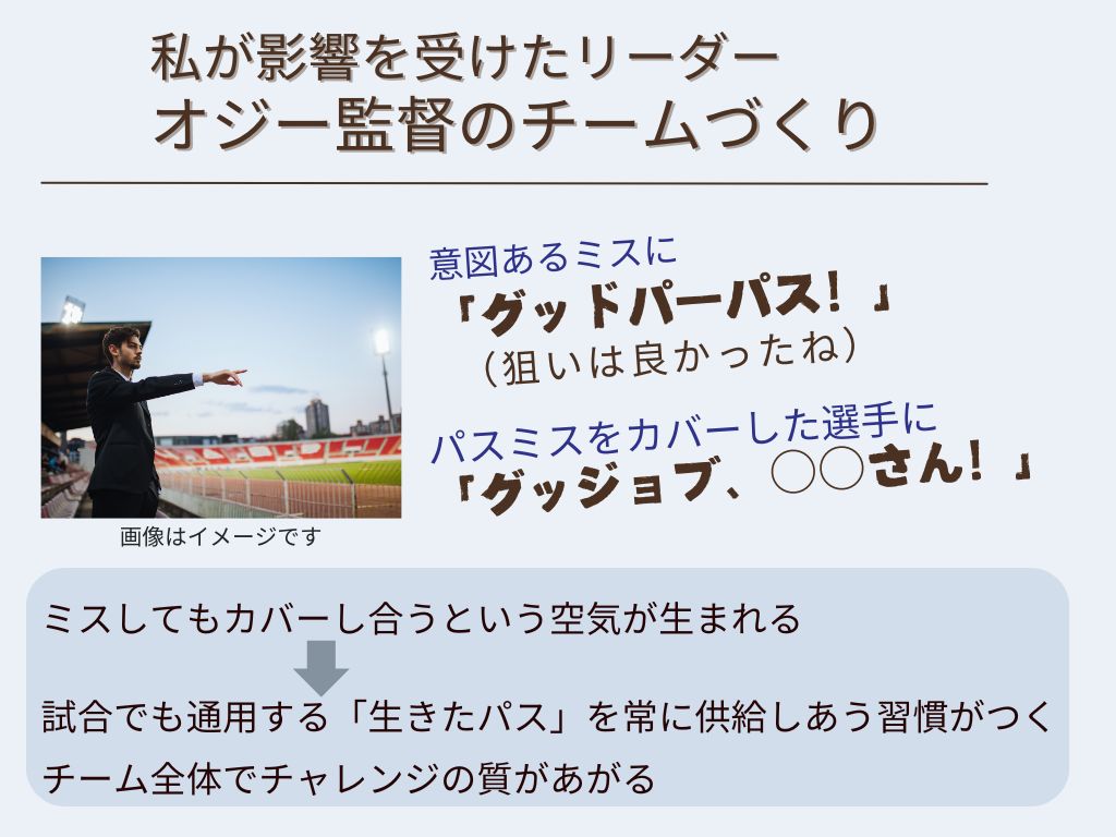 でも、オジーは、意図のあるミスには「グッドパーパス(狙いは良かったね)!」と声をかけてくれたり、パスミスをカバーしてあげた選手に、「グッジョブ、○○さん!」とちょっとした良い行動を見て声をかけていたんです。