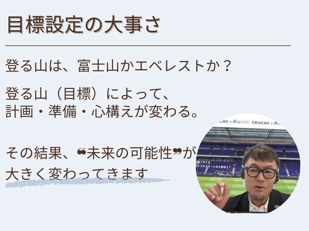 この経験を通じ、「目標設定の大事さ」を痛感しました。たとえば、山に登るという目標があったとしても、それが富士山かエベレストかによってまったく違います。目標設定によって、計画も準備も変わる。一番は心構えが変わります。その結果、未来の可能性が大きく変わってくるのです。