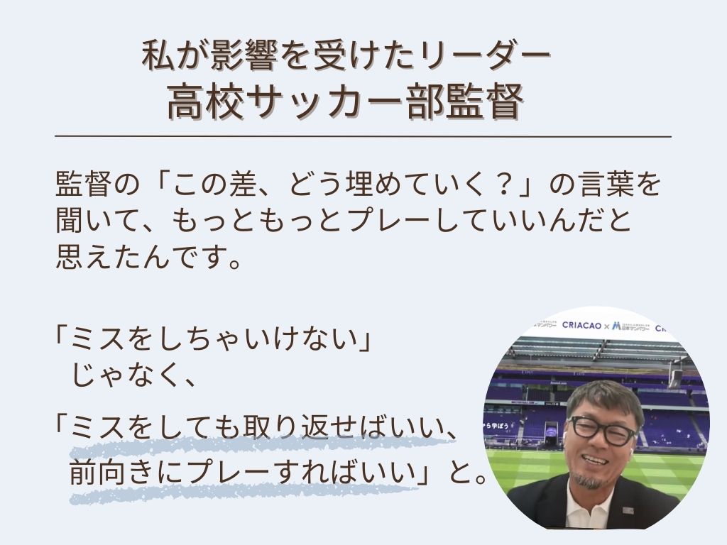 森岡:今日は素敵な機会をいただき、ありがとうございます!私は3歳でサッカーに出会い、以来ずっとサッカーに夢中の日々を過ごしてきました。今日はサッカーを通じて経験した学びを、今日のテーマ「リーダーシップ」を中心にお話させていただきます。
